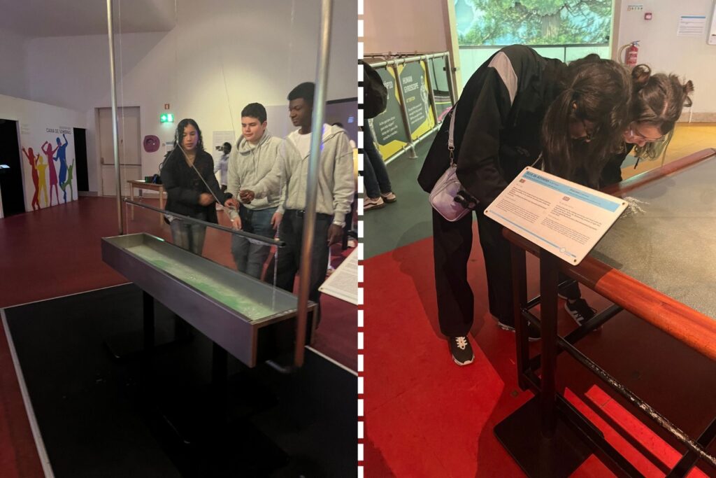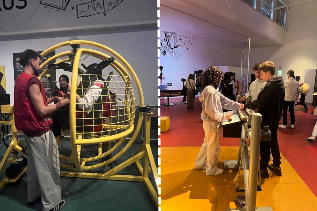 A manhã começou de forma dinâmica no Pavilhão do Conhecimento. Aqui, os alunos tiveram a oportunidade de explorar diversas exposições interativas, onde a física, a química e a tecnologia deixaram de ser conceitos abstratos dos manuais para se tornarem desafios práticos. Entre bicicletas voadoras e experiências sensoriais, o entusiasmo foi constante, provando que a ciência pode — e deve — ser divertida.